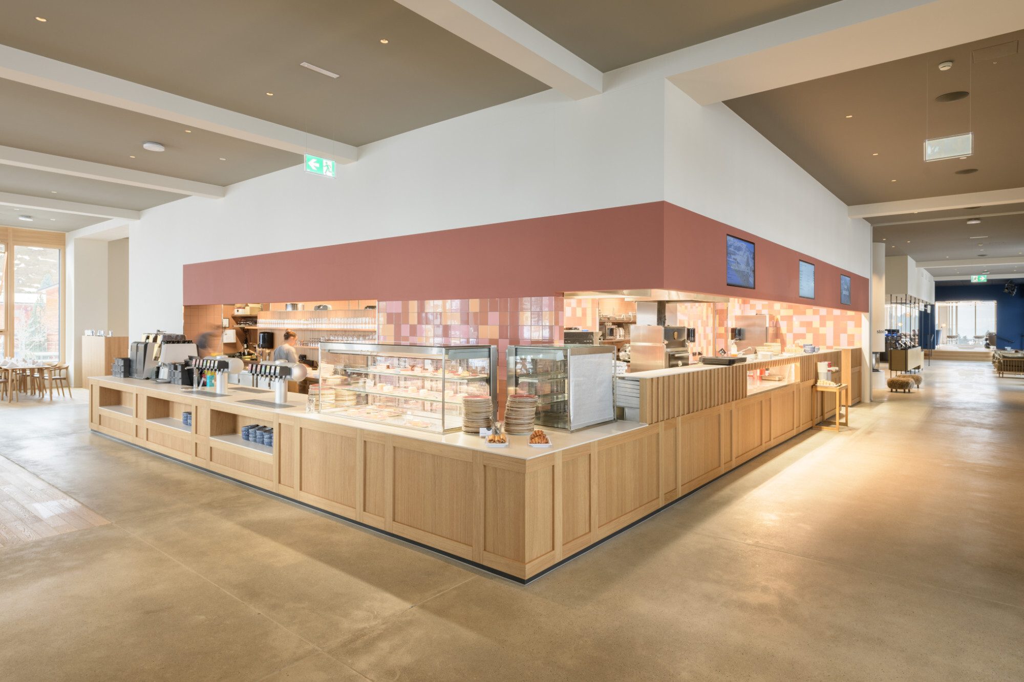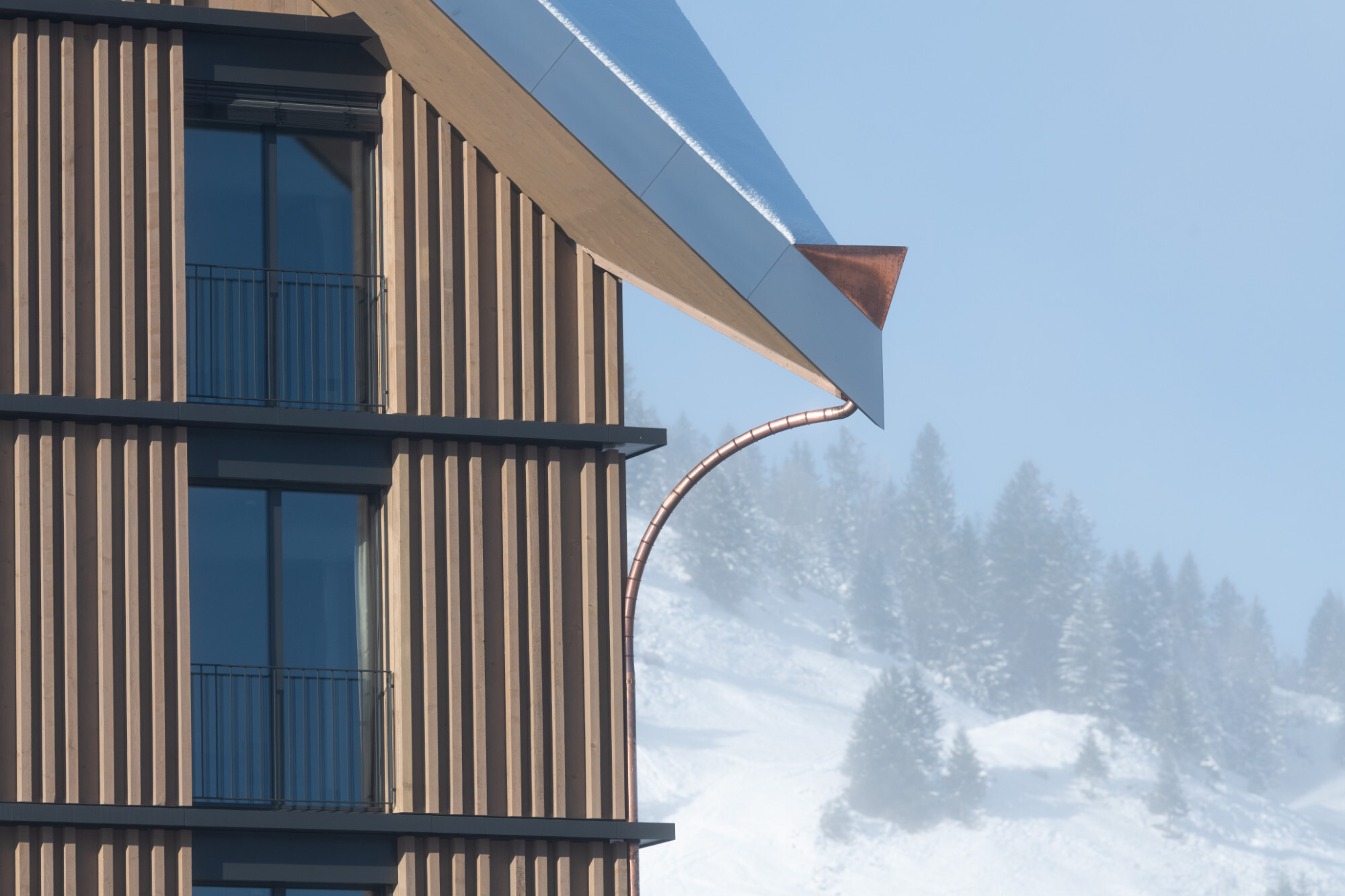 Genauso bedeutsam ist die ortsbildende Funktion der Stoos Lodge. Im Zusammenspiel mit der Bergstation der neuen Standseilbahn verleiht sie dem Dorf eine neue Mitte, sowohl funktional - als zentrale Ankunftsstelle der Ortserschliessung -, als auch visuell - durch die markante Erscheinung. Die Bergstation und die Stoos Lodge stehen als Nachbarbauten in Schrägstellung zueinander und definieren auf diese Weise einen dreieckigen Platz, der das Ensemble bekräftigt. Dabei stellt sich die Stoos Lodge den eher flachen Gebäudekörper der Bergstation als kompakter vertikaler Bau gegenüber, angelehnt an das Erscheinungsbild historischer Berghotels. Der zentrale und hohe Hauptkörper nimmt ein Grossteil der Hotelfunktionen auf. Er ruht auf einem ausgedehnten Sockel, der als abgestufte Plattform mehrere untergeordnete Annexbauten bildet und die Geländetopografie betont. Durch die zwei teilweise hervorstehenden Untergeschosse und die sieben oberirdischen Geschosse ist die Stoos Lodge von weit her sichtbar. Durch die Anwendung eines alpinen Bauvokabulars wird sie trotz ihrer Grösse in den Kontext des Bergdorfes und in die umliegende Berglandschaft integriert. Der massiv wirkende mineralische Sockel, die durchgehenden Holzfassaden und das mit Naturschiefer bedeckte Steildach sind einige Beispiele dazu.